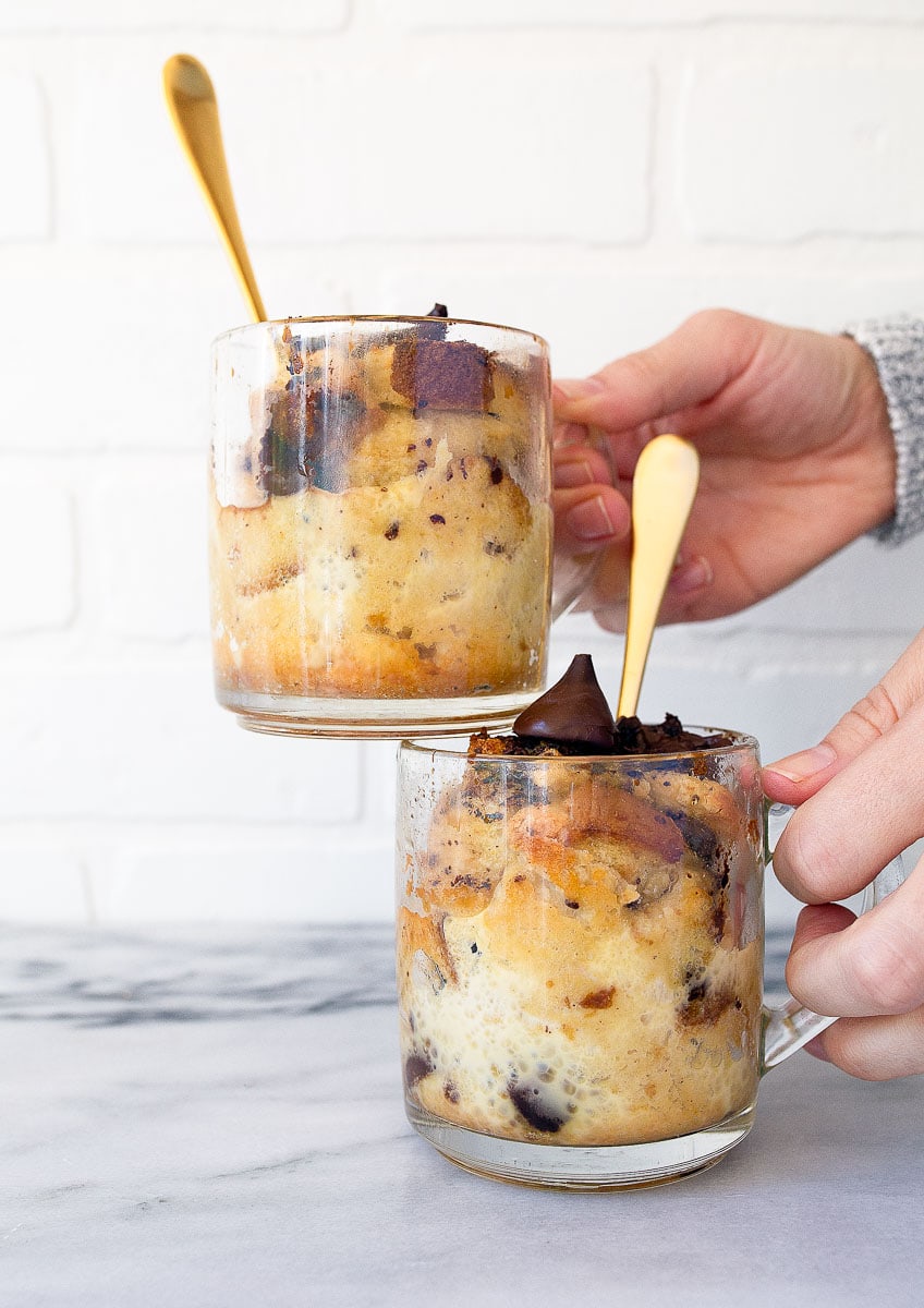 Chocolate bread pudding made in two mugs.