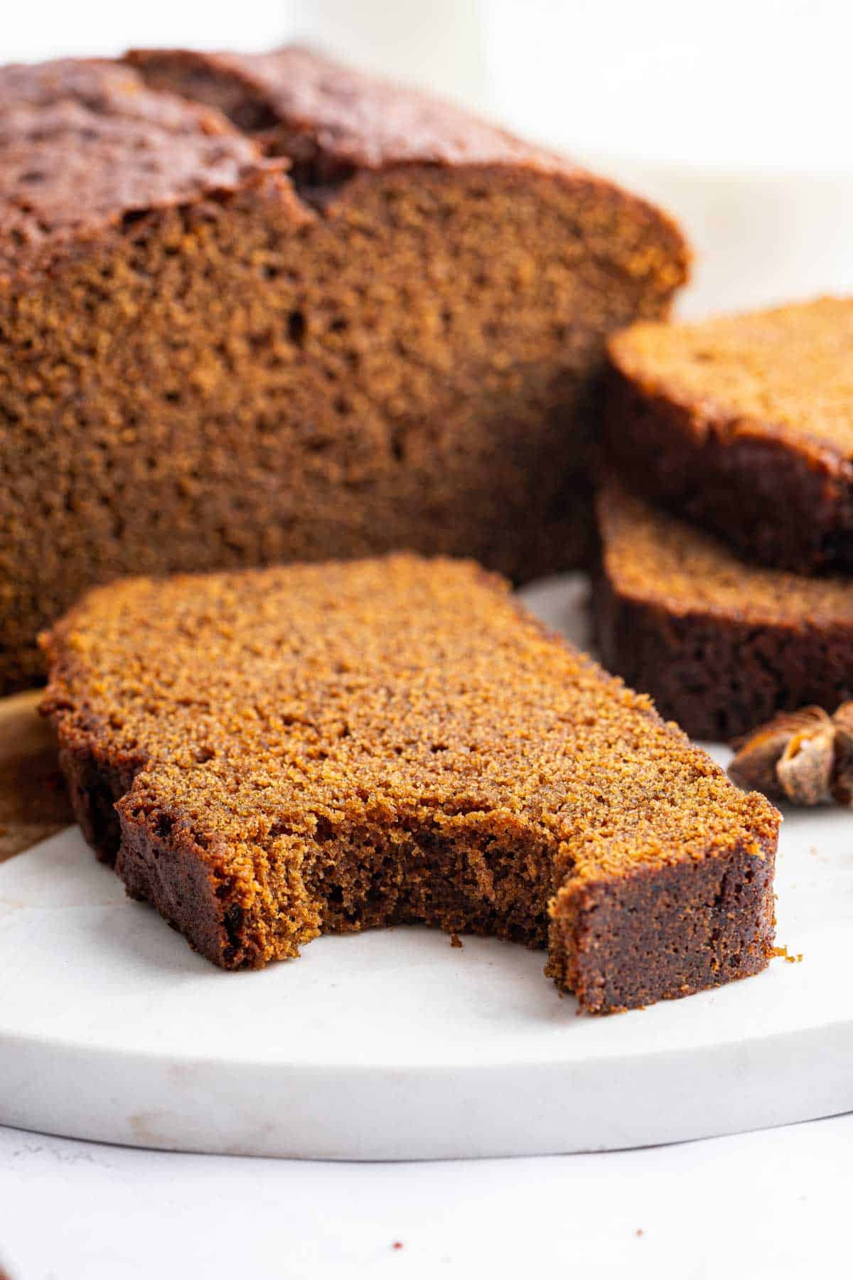 I let this gingerbread loaf cake cool completely, and then tip it out onto a wire rack. I slice it with a serrated knife and serve it as-is. If you want to amp it up a bit, serve it with a dollop of whipped cream that you spiked with some ginger syrup or ground ginger to extra spice.
