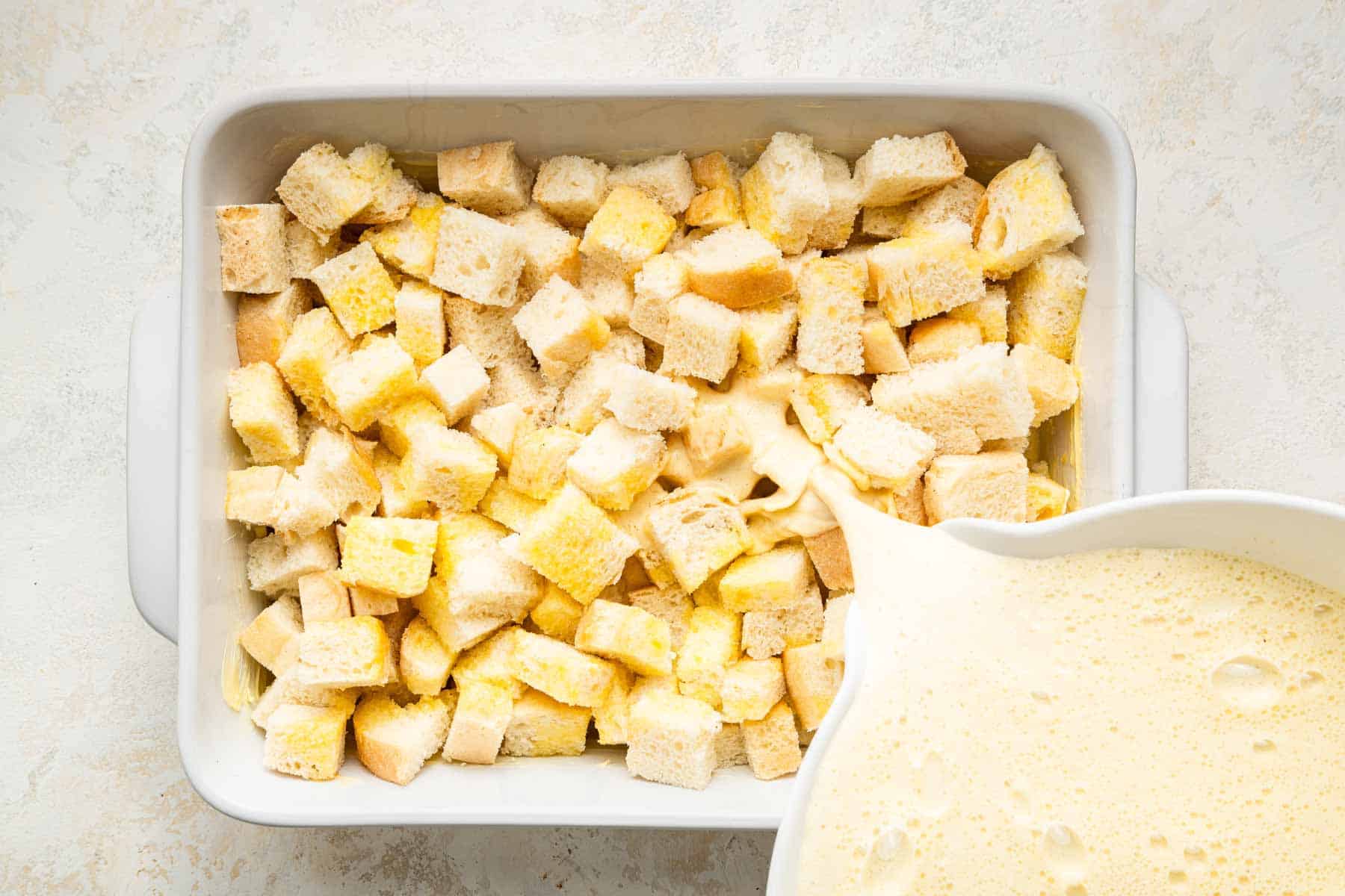 Before starting the recipe, be sure to slice the bread into one and two-inch cubes. And, use the extra tablespoon of butter to grease the 11ร9-inch baking dish very well.