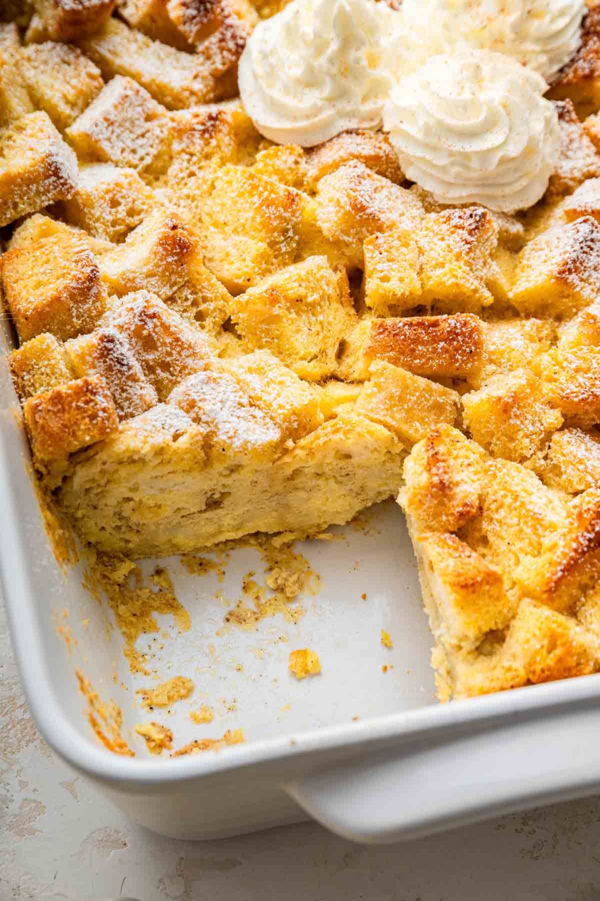 If youโre an eggnog lover, have you made my small batch of eggnog? It comes in handy for late night cravings. This recipe for bread pudding requires a full 2 cups of already made eggnog, and you can absolutely use my recipe for a small batch here. (Be sure to use 1 cup of heavy cream instead of 3/4 cup), and just so you know: folding in the egg whites is still optional.