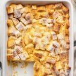 If you can manage to save a few cups from the bottle, you can make this breakfast slash dessert all December long. This Eggnog Bread Pudding is welcome for dessert, brunch, or Christmas morning breakfast. Itโs so easy to make, and does not require any cooking on the stove top!
