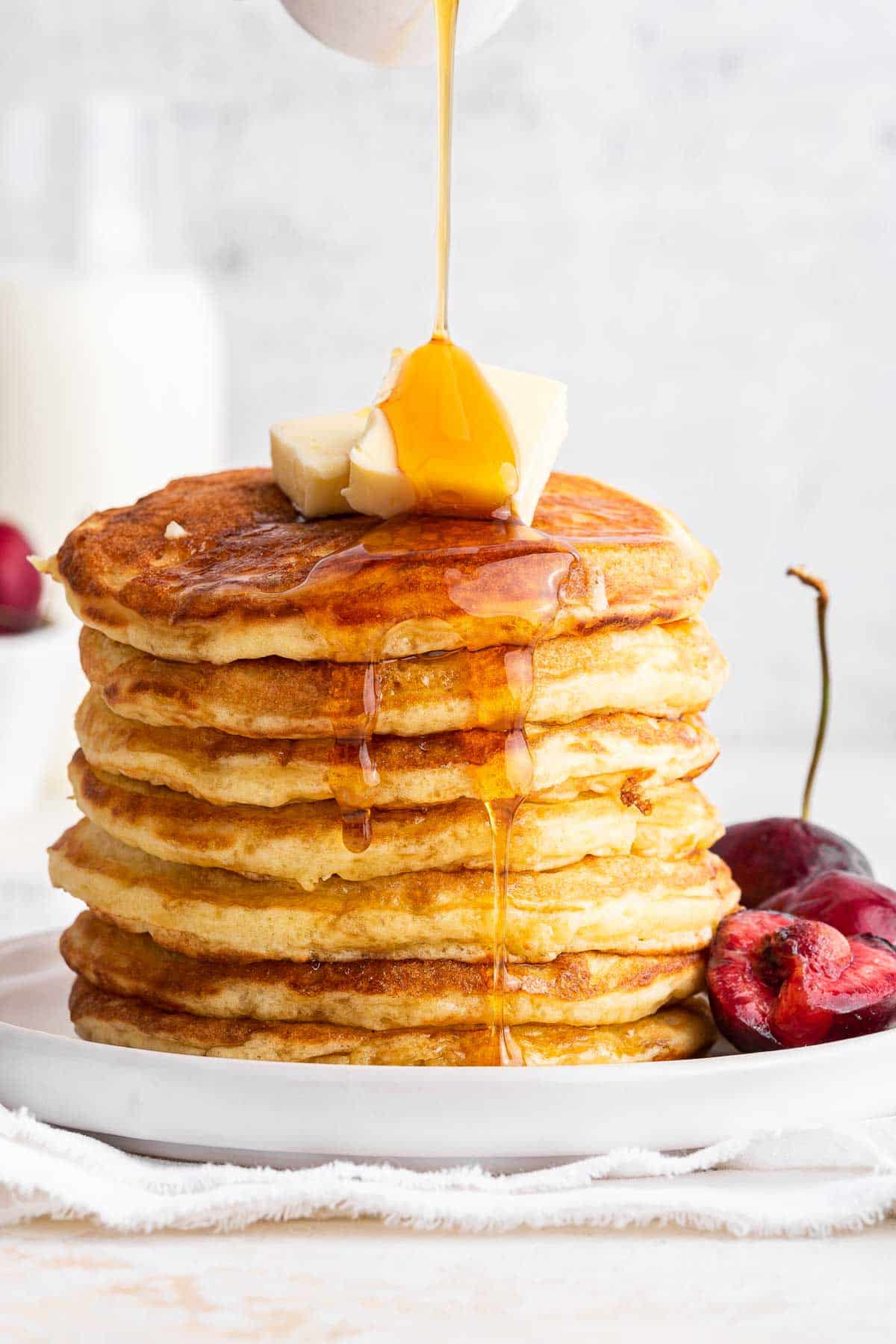 My recipe for pancakes for two has become so popular that I knew I had to scale it up for you. The original recipe is so delicious because it relies on buttermilk, a big dose of vanilla, and plenty of melted butter in the batter. If you donโt have buttermilk, sour cream is an easy swap that many of you have used!