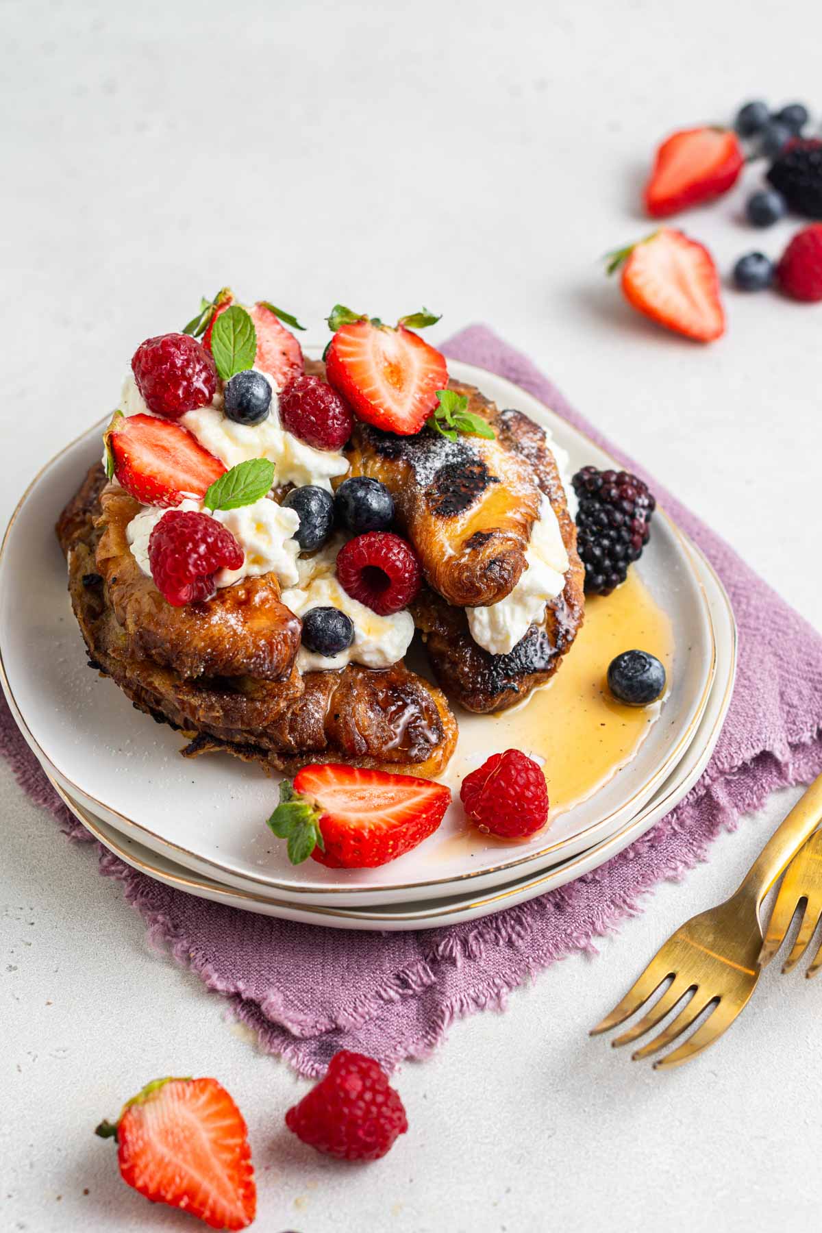 - These croissant French toast pieces are amazing as-if, just sprinkled with powdered sugar and served. However, you can also add whipped cream, fresh berries and maple syrup for an even more decadent holiday breakfast!