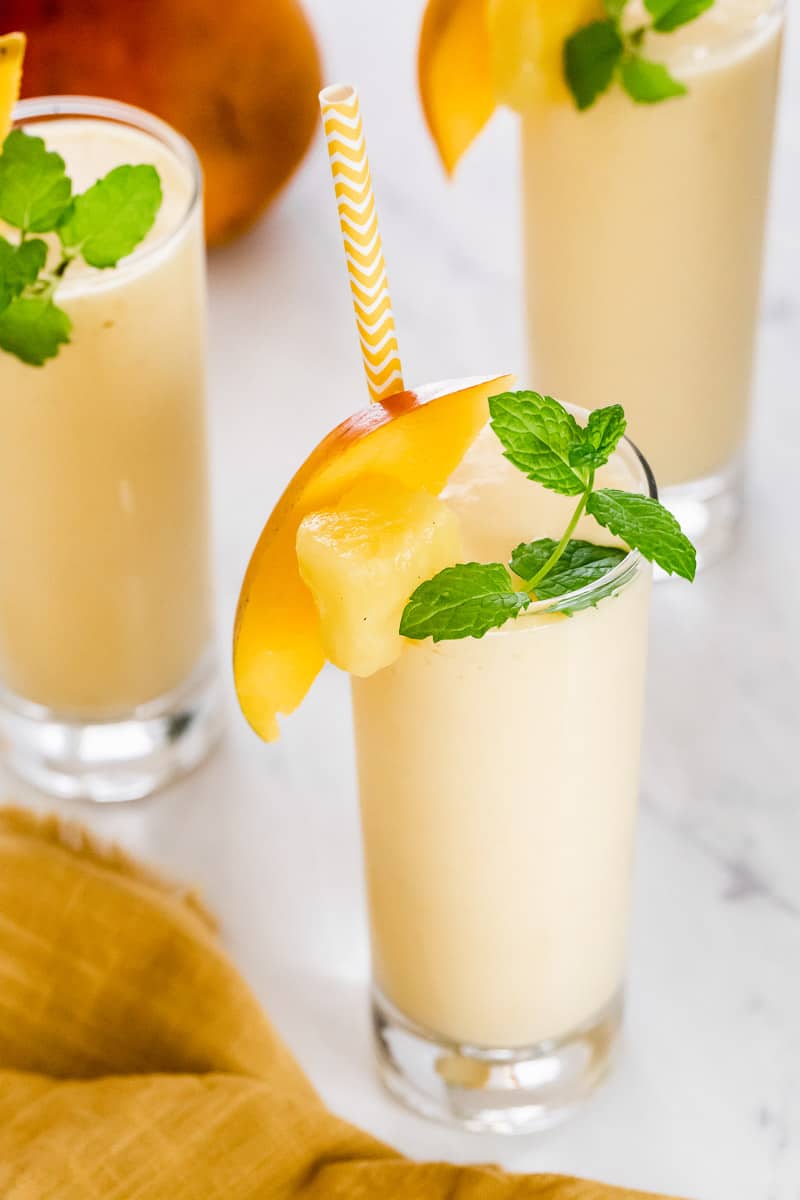 Mango pineapple smoothie made with frozen fruit, coconut milk and honey.