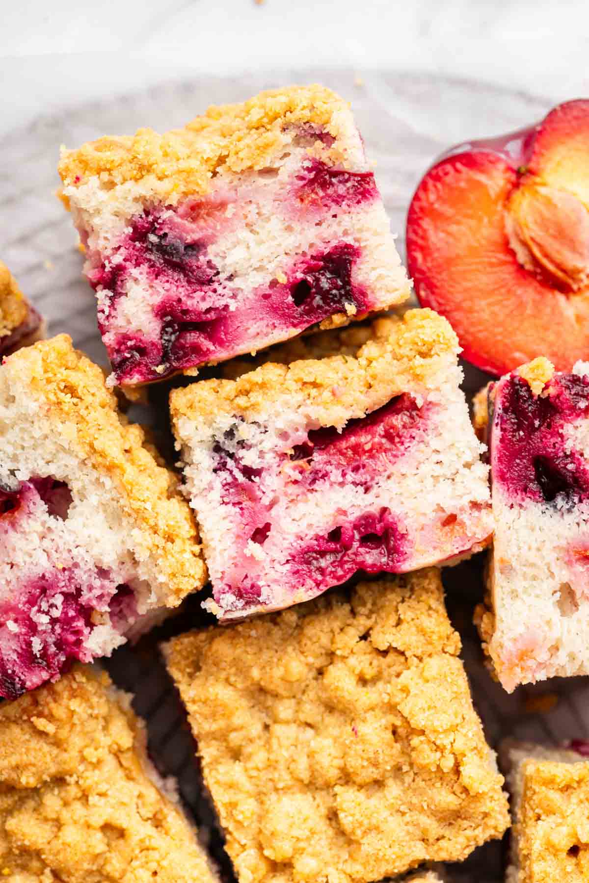 If you have the last few pieces of summer fruit ripening in your produce bowl, I have the best easy single layer cake recipe for you. This Plum Cake has a streusel made with ginger, cornmeal, and brown sugar to make a light, crisp topping. Youโre going to want to save this recipe!