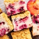 Evenly sprinkle the streusel mixture on top, and then bake for 35-38 minutes, until a cake tester comes out clean (some moist crumbs are okay). Let cool, cut into squares and serve.