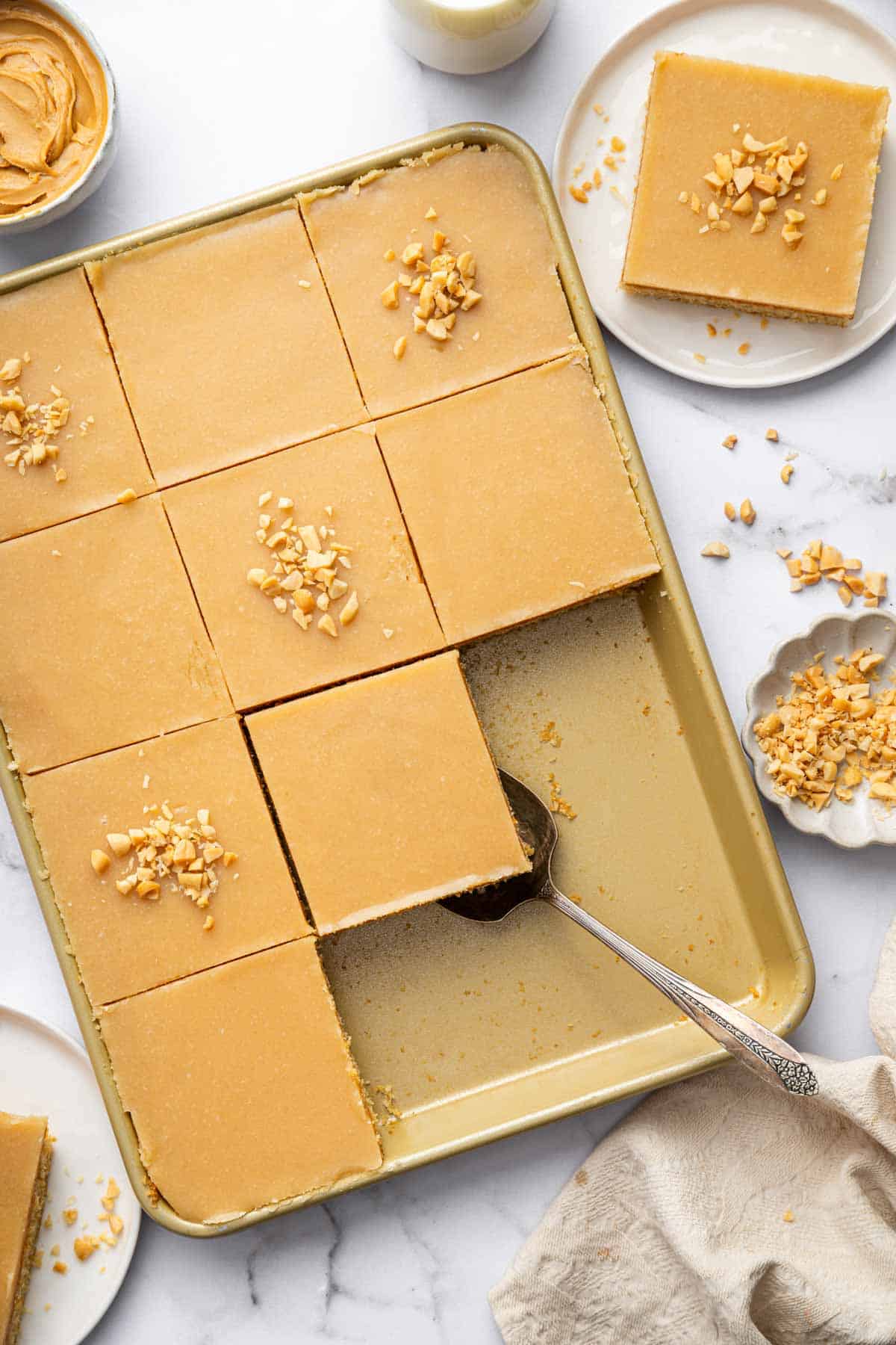 My Texas chocolate sheet cake in a quarter sheet pan has become a favorite, and so I know youโll love the peanut butter version of it. If you want to mix and match the frostings for these recipes, please do! A chocolate cake with peanut butter fudge frosting sounds just as good as a peanut butter cake with chocolate frosting!