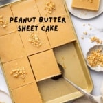 Grab your small baking pan, because we have another recipe to make with it! This Peanut Butter Sheet Cake has a rich frosting that is similar to fudge plus a soft, tender cake underneath. Itโs the best use for that quarter sheet cake pan you have!