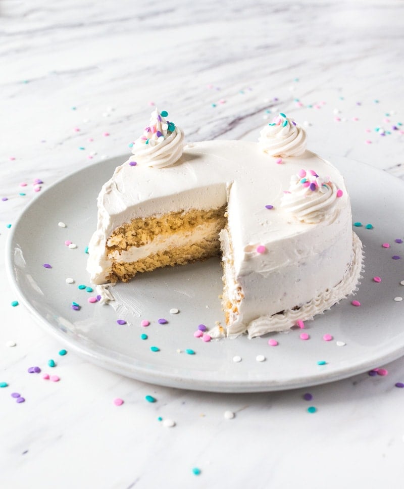 - Once the cake is cool, slice it in half horizontally. Place the bottom of the cake on a plate, and scoop โ of the frosting on top. Spread the frosting almost to the edges. Place the remaining cake layer on top, and frost with the remaining frosting. If desired, portion some frosting into a bag fitted with an open star tip and decorate the cake with buttercream swirls and sprinkles.
