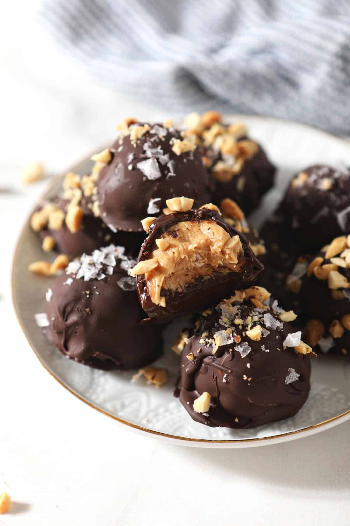 Peanut butter truffles dipped in melted chocolate with a sprinkling of sea salt and crushed peanuts on top. This recipe is entirely no bake, and naturally gluten free; you will love this recipe for easy gift-giving, a sweet snack, or for a homemade Valentineโs Day treat.