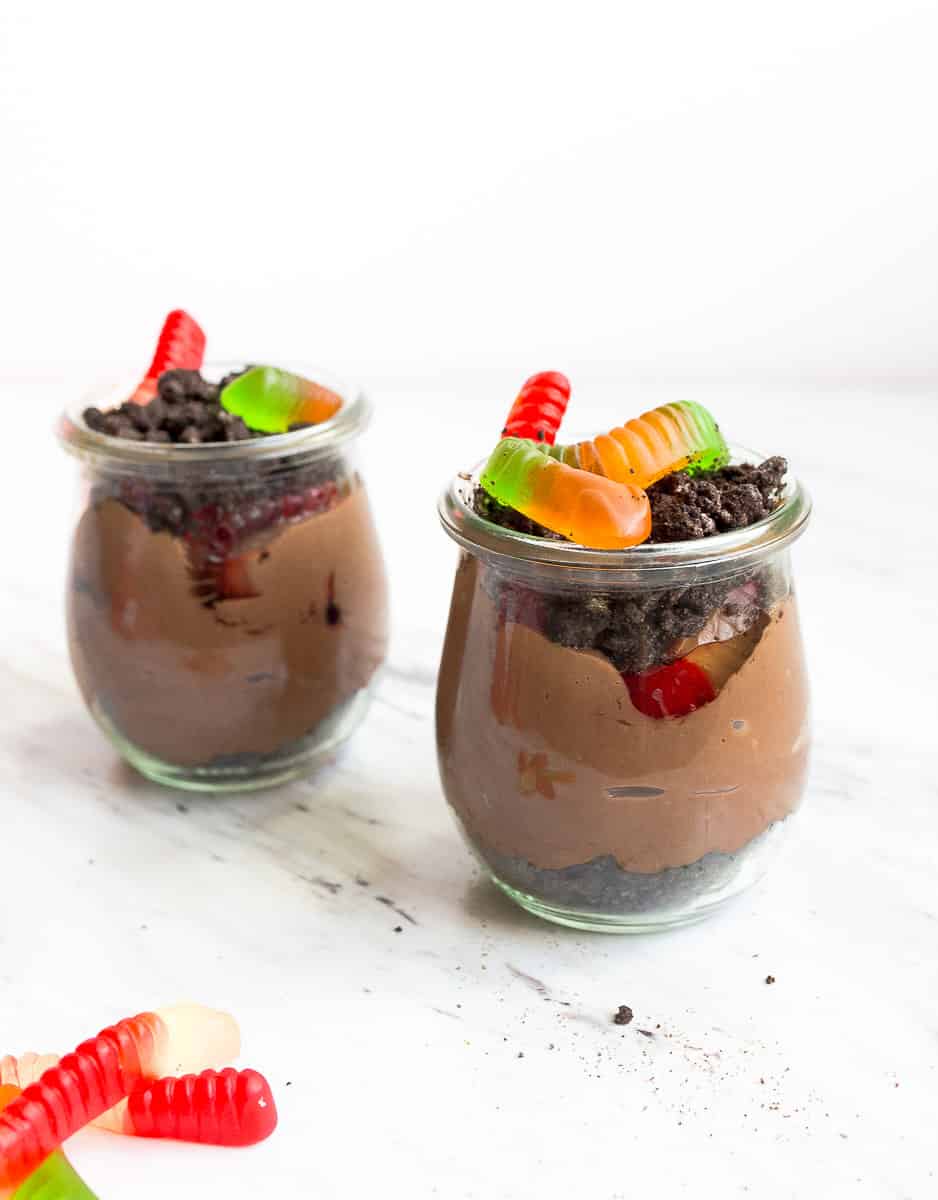 - To serve, layer one quarter of the crushed cookies in the bottom of a small serving jar. Top with one quarter of the chocolate pudding. Repeat with another quarter of the cookies and pudding. Push a few gummy worms in. Repeat with another jar to make 2 jars total.
