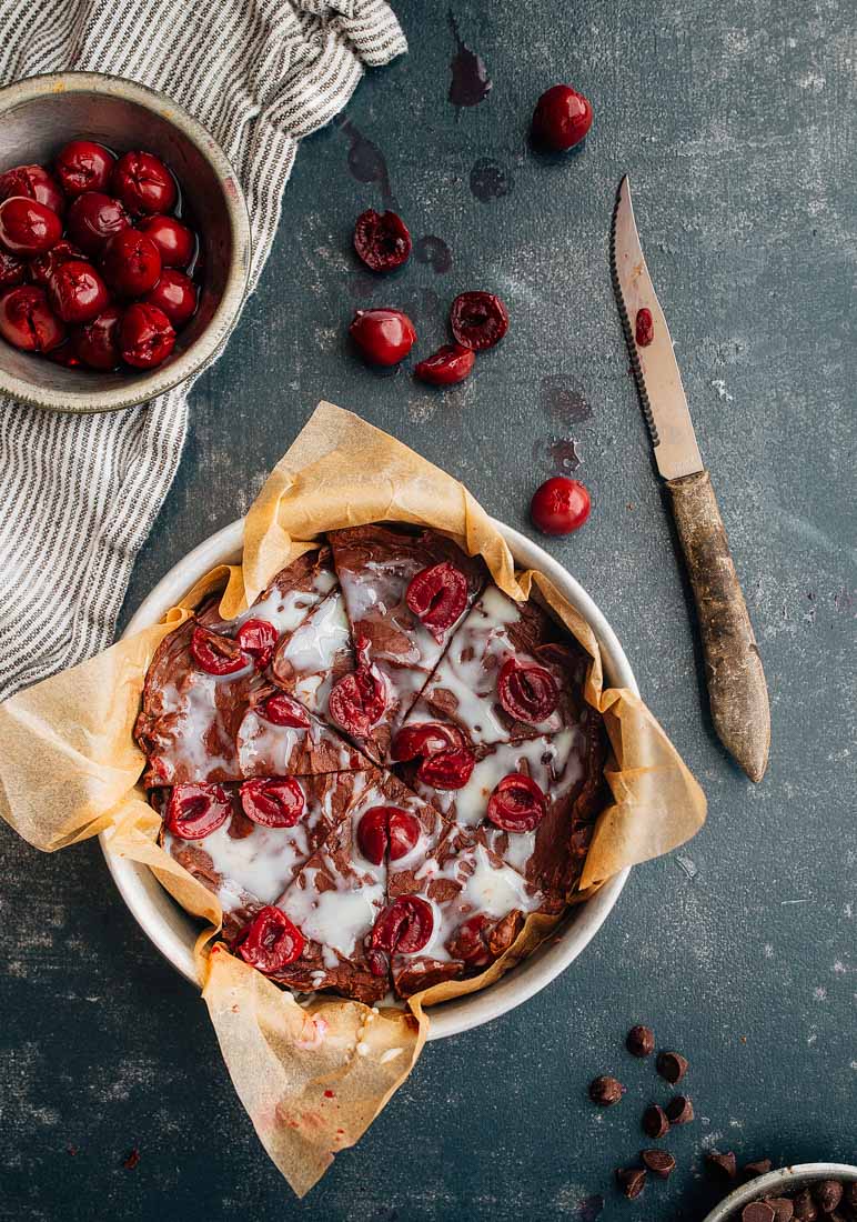 For this recipe, I spread half of the fudge in the pan, top with a layer of canned Morello cherries (my absolute favorite because theyโre sweet with a touch of sour), and then spread the remaining fudge on top. An extra drizzle of Eagle Brand Sweetened Condensed Milk on top really drives home the cherry cordial flavor. I canโt get enough.