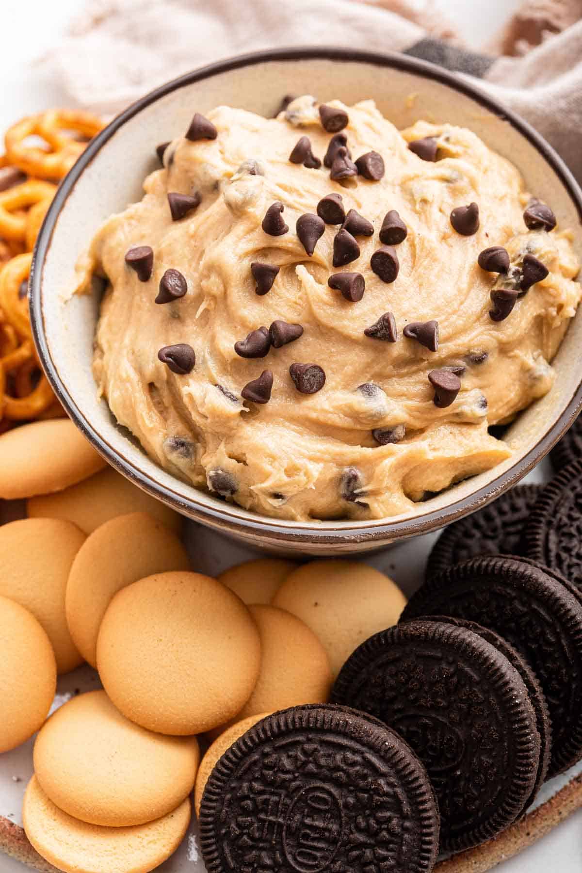 You should serve this with whatever you like to dip! My favorite is salty pretzels because I love the salty and sweet combination! I also like to dip vanilla wafers, sugar crisp wafers, dried banana chips, sugar cookies, and of course, crispy chocolate chip cookies! I actually think you havenโt lived unless youโve spread cookie dough dip between two crispy chocolate chip cookies, and eaten it like a sweet sandwich.