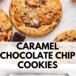 If there has ever been a better โpick meโ cookie, then I havenโt eaten it yet. These Caramel Chocolate Chip Cookies scream โpick meโ at you from a table full of desserts. They are the one cookie everyone reaches for, and the salty flakes on top keep them coming back for more.