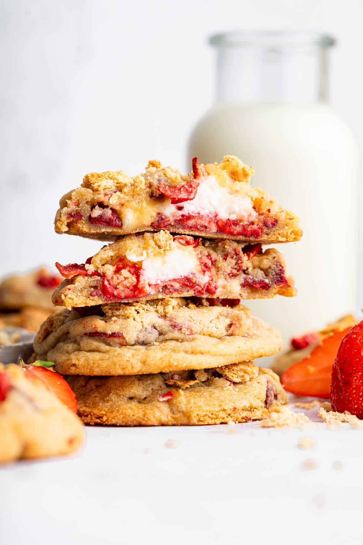This dessert is best on the same day they are made, because both the graham crackers and strawberries soften over time. You may bake them and freeze them for up to 3 months, and then defrost at room temperature on the counter, if you like. You can also prepare the dough balls ahead of time and freeze. In that case, bake these strawberry cheesecake cookies directly from frozen, adding one minute of baking time.