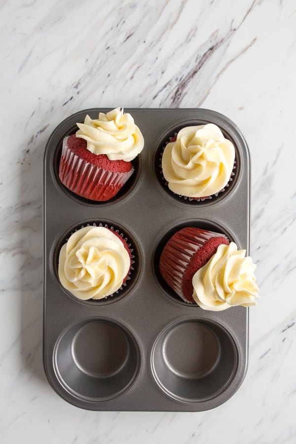 If you double this recipe, bake it in a 6โณ round cake pan for a single layer red velvet cake cake. I learned this from my mom, who upon me posting this red velvet cupcake recipe, immediately doubled it to bake in a 6โณ cake pan.ย If youโre doing this, I would also double the cupcake frosting recipe, and you will have enough for a single-layer cake.