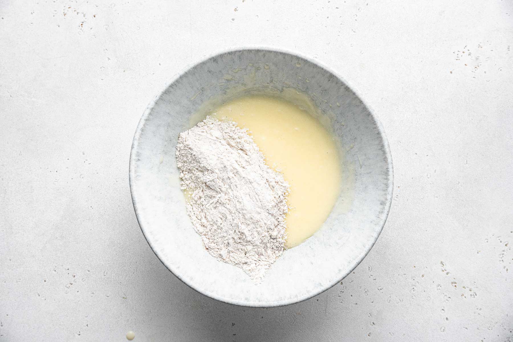 Now, pour the dry ingredients in the bowl of the wet ingredients, and stir to combine. At first, you wonโt see the coffee, but it will dissolve and dye the batter a lovely golden shade.