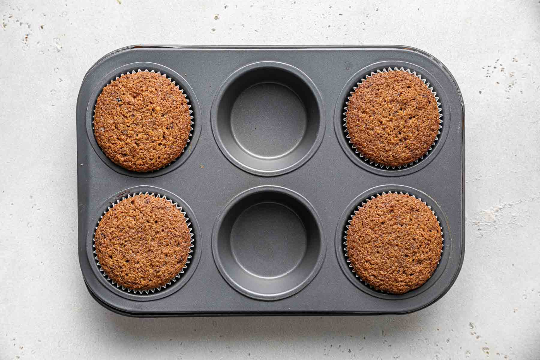 - Divide between 4 cupcake liners and bake for 15-17 minutes, until a toothpick inserted comes out with only a few moist crumbs clinging to it. The cupcakes will be flat, not domed like muffins.