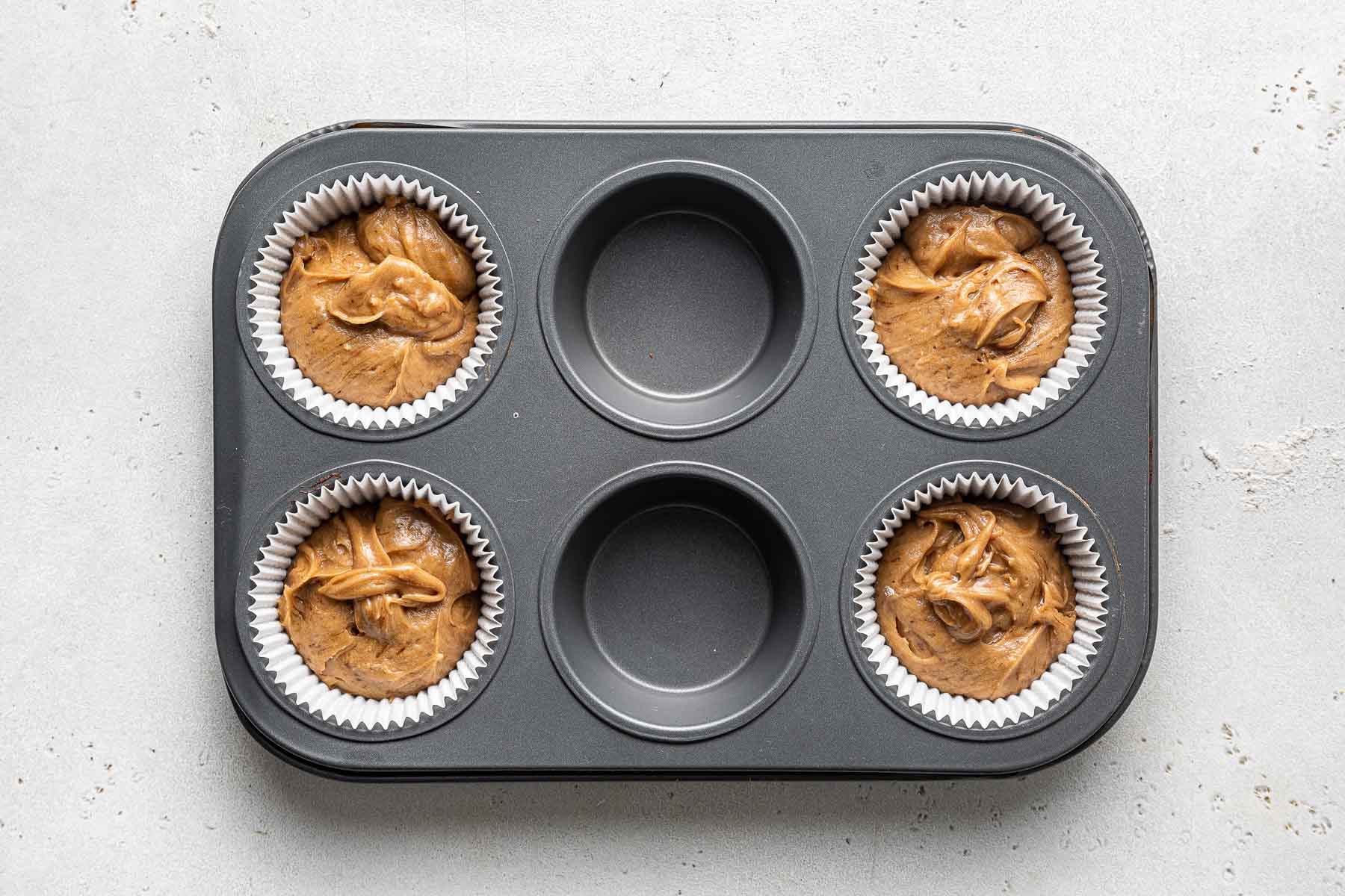 Once the batter is fully combined (but be careful not to over-mix), itโs time to scoop it into a muffin pan lined with cupcake liners.