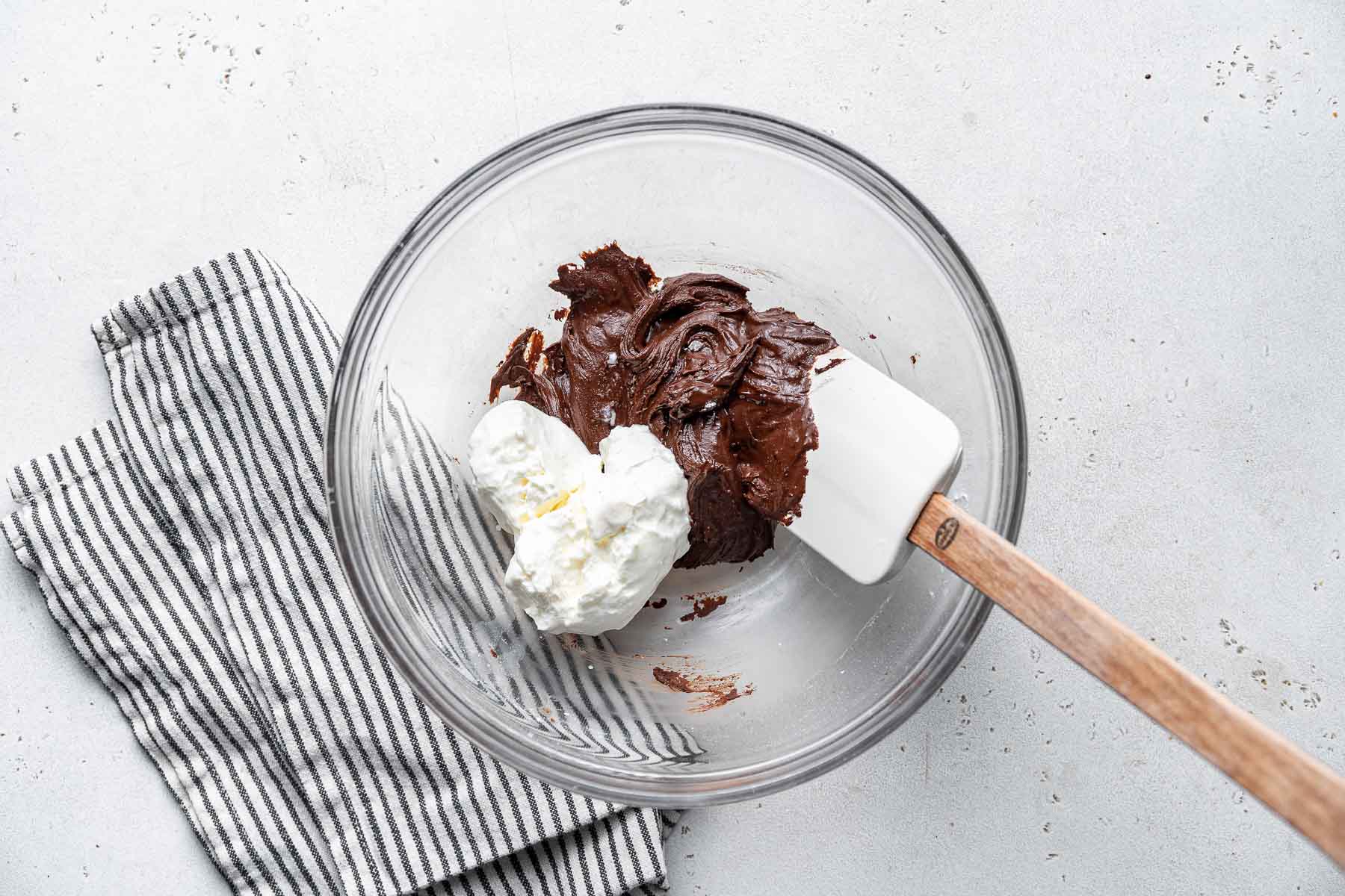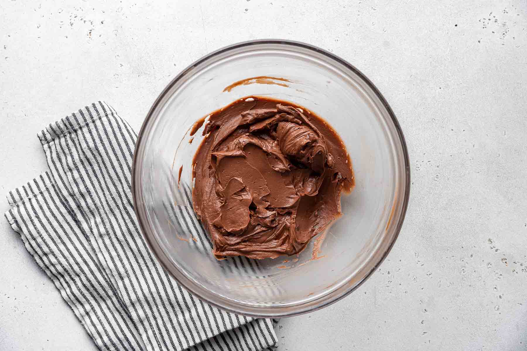 Next, add the sour cream and stir in very well. Itโs important that the chocolate is fully melted before stirring in the cold sour cream, or else your final frosting will have lumps.