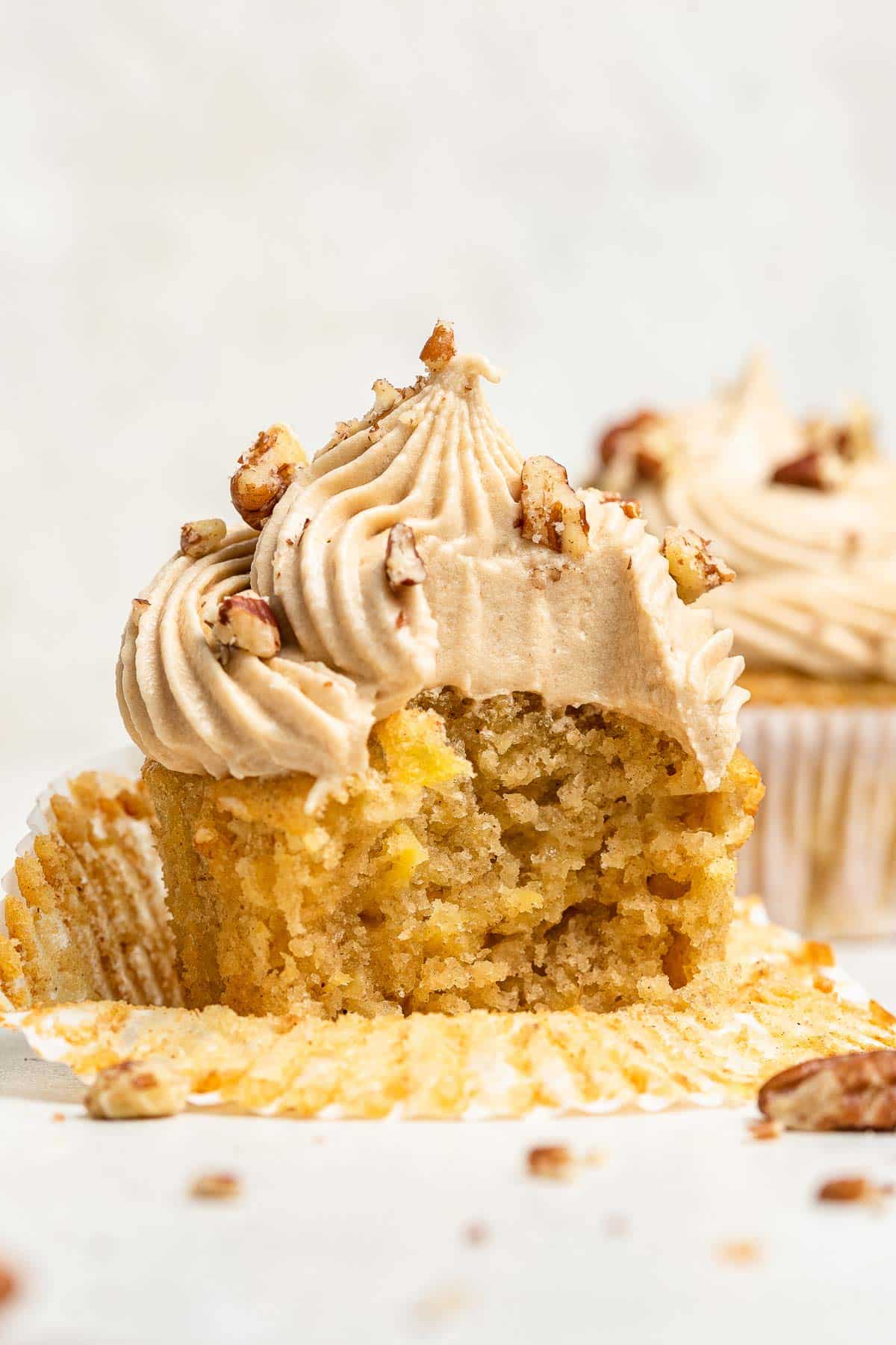 The cupcake frosting is my brown sugar cream cheese frosting. Each bite is packed with flavor, and I absolutely cannot get enough. If you want to add a splash of rum to it, I wonโt judge. If you want something lighter, try my whipped cream cream cheese frosting instead.