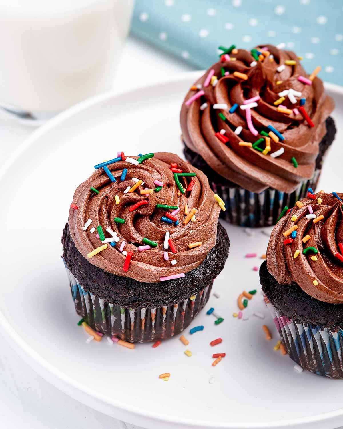 7. Add the cocoa powder and a splash of milk, and continue beating until soft, fluffy and pipeable. Use additional milk in small splashes, if needed. Scrape the frosting into a piping bag, frost the cupcakes and add the sprinkles and serve.