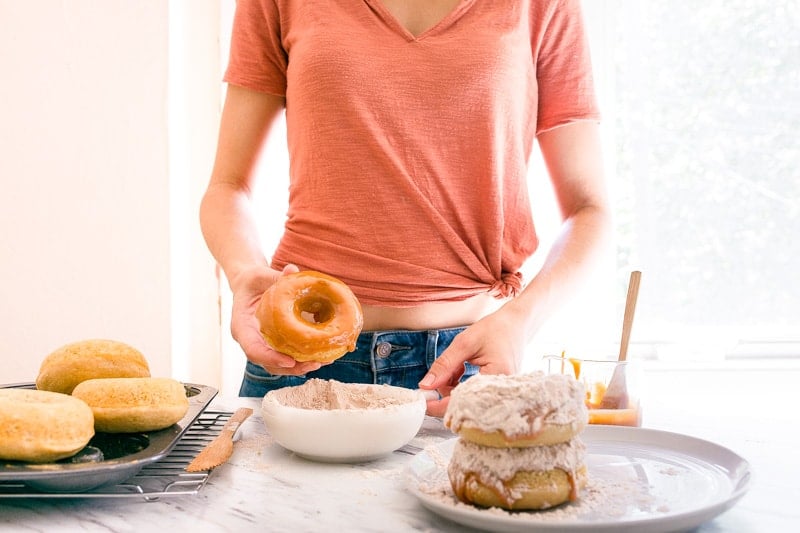 Regardless, I grabbed the best recipe on the internet for baked donuts (itโs Joy the Bakerโs browned butter baked donuts, you knew that!), made a caramel glaze, and a little cinnamon powdered sugar bath. And again, I ate two right after making them.