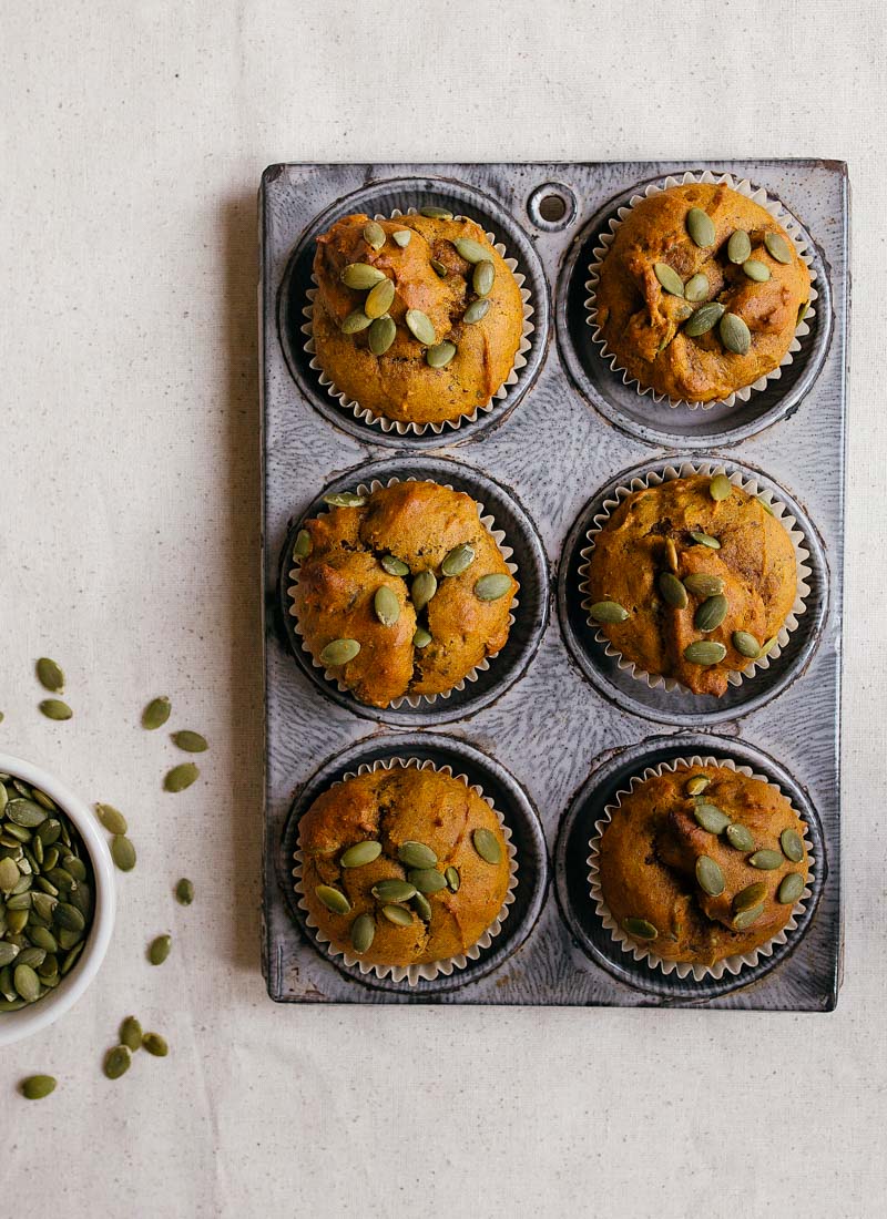 Now Iโm not saying these muffins are magical, but I baked them last night (subbed in an egg + chocolate chips for the flax seed + pepitas), and I woke up to the most perfect fall weather and got to enjoy my pumpkin muffin on the front porch with a hot cup of chai. So maybe they are a little bit magical? Iโll definitely be making these again soon!