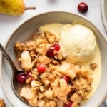 So, you can have a boring cobbler that consists of mushy fruit, boring spices, and crunchy topping, or you can have my pear crumble with white chocolate chips, pops of cranberries, and fresh pear. I think I know which one youโre going to pick!