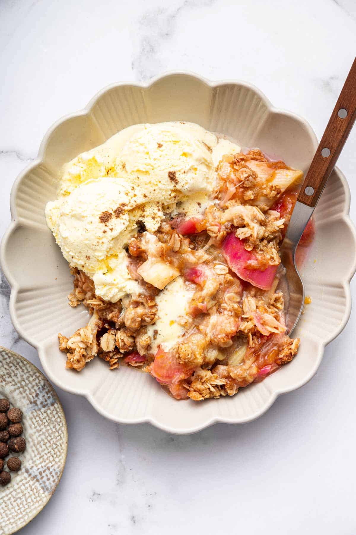 - Scatter the topping evenly over the rhubarb, and slide it in the oven for 20-25 minutes, until golden brown and bubbling around the edges.