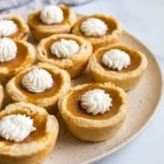 I still make these mini pumpkin pies when we have pumpkin pie cravings. This recipe makes 10 pumpkin pie bites, but can easily be doubled. If youโre looking for something even easier, try my crustless pumpkin pie.