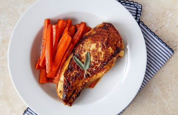 The carrots are glazed in apple cider, too, and they cook right in the same pan! This one-pan chicken recipe for two is so simple!