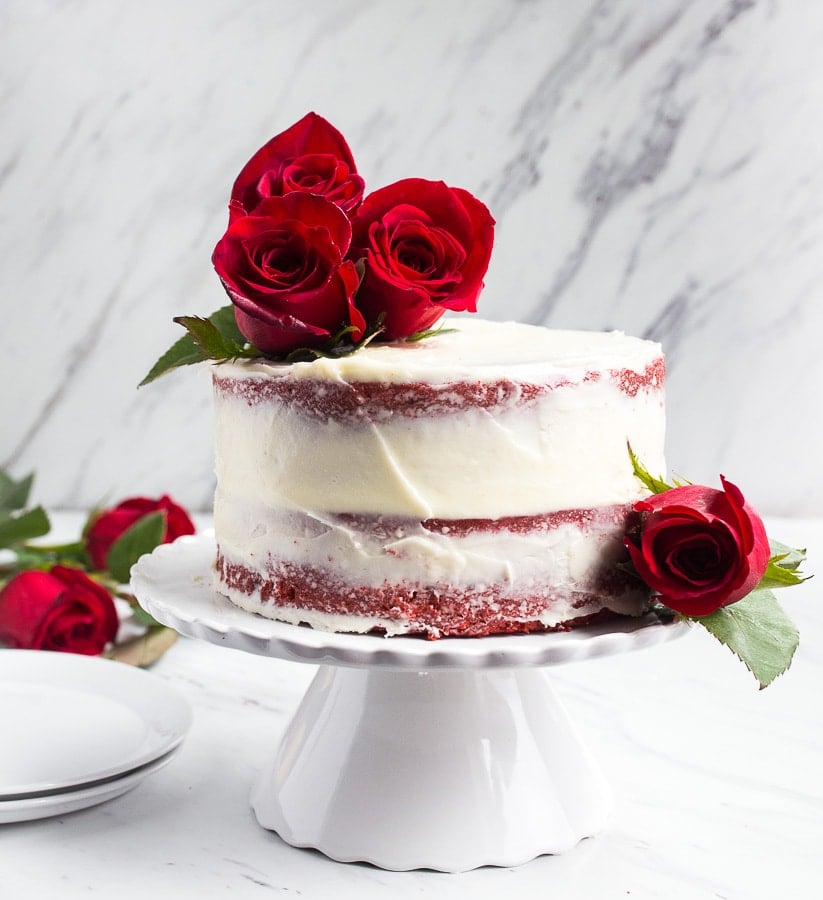 For decorating this cake, there are so many directions you can go. I like the look of a โnaked cake,โ which is when a minimal amount of frosting is placed on the outside of the cake and then swiped off. In this case, I make sure to pack quite ย a bit of frosting between the cake layers to make up for the lesser amount of frosting on the sides of the cake. See how, in my photo, you can see the edges of the red velvet cake recipe peeking through? I love this!