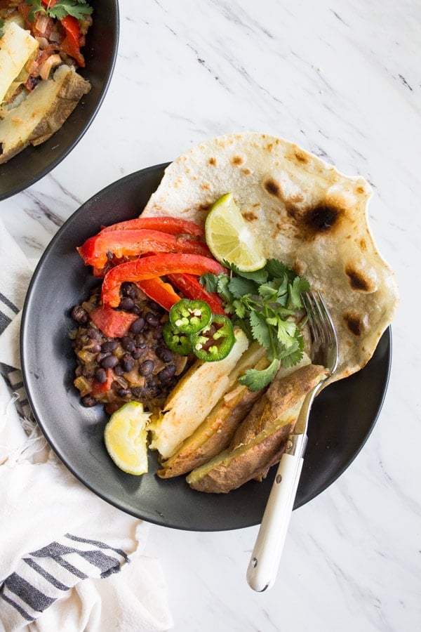 Vegan Mexican black bean burrito bowls made with baked potatoes, black beans, veggies, and other pantry ingredients!