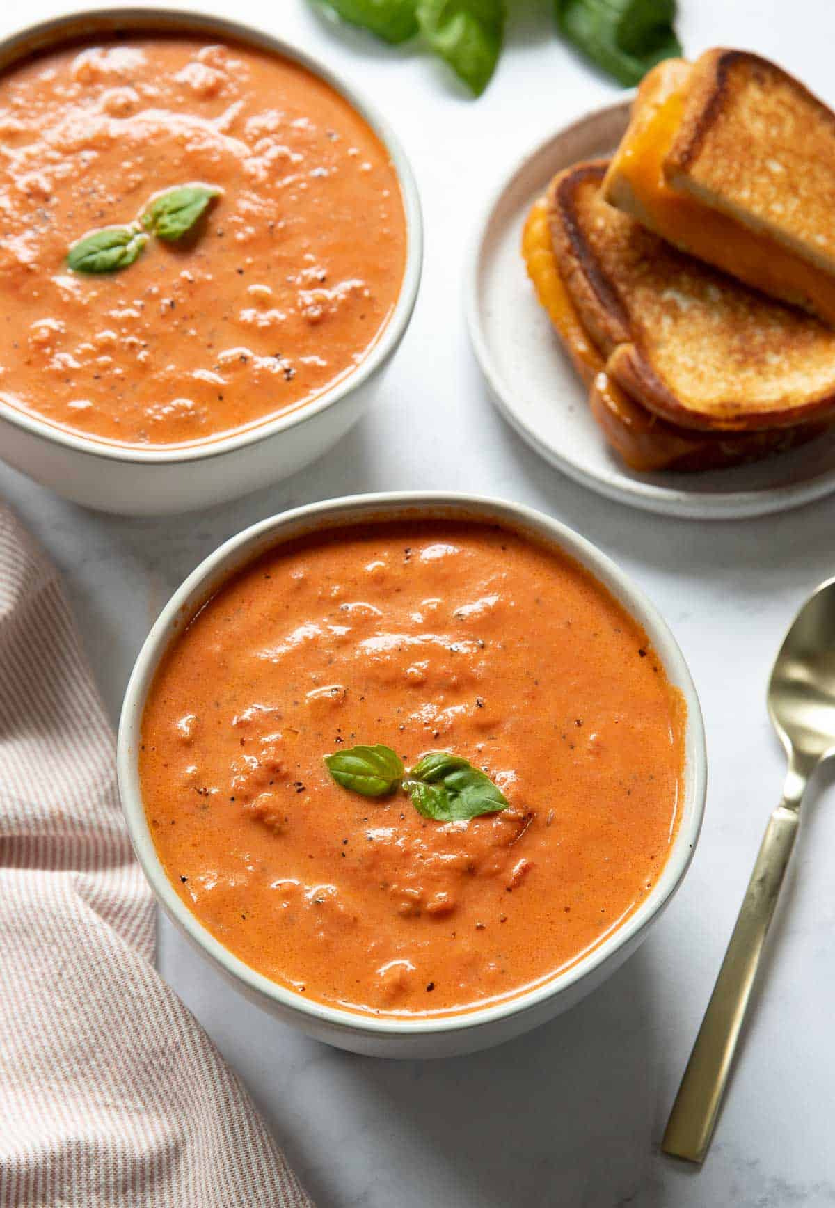 Oh my, another absolutely fantastic recipe from Dessert For Two! This soup is delicious. I cut my grilled cheese up into little โcroutonsโ and put them right in the soup, where they got soaked with this delicious soup. We will definitely have this again and again!