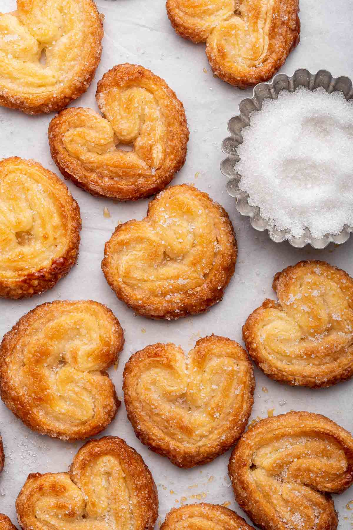 - Let the palmiers rest on the sheet for a few minutes, but then let them cool completely on a wire rack. They will crisp as they cool.