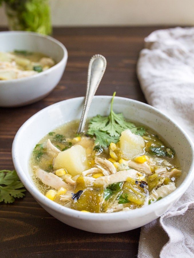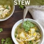 Green Chile Chicken Stew with potatoes, corn, and fresh Hatch green chiles!