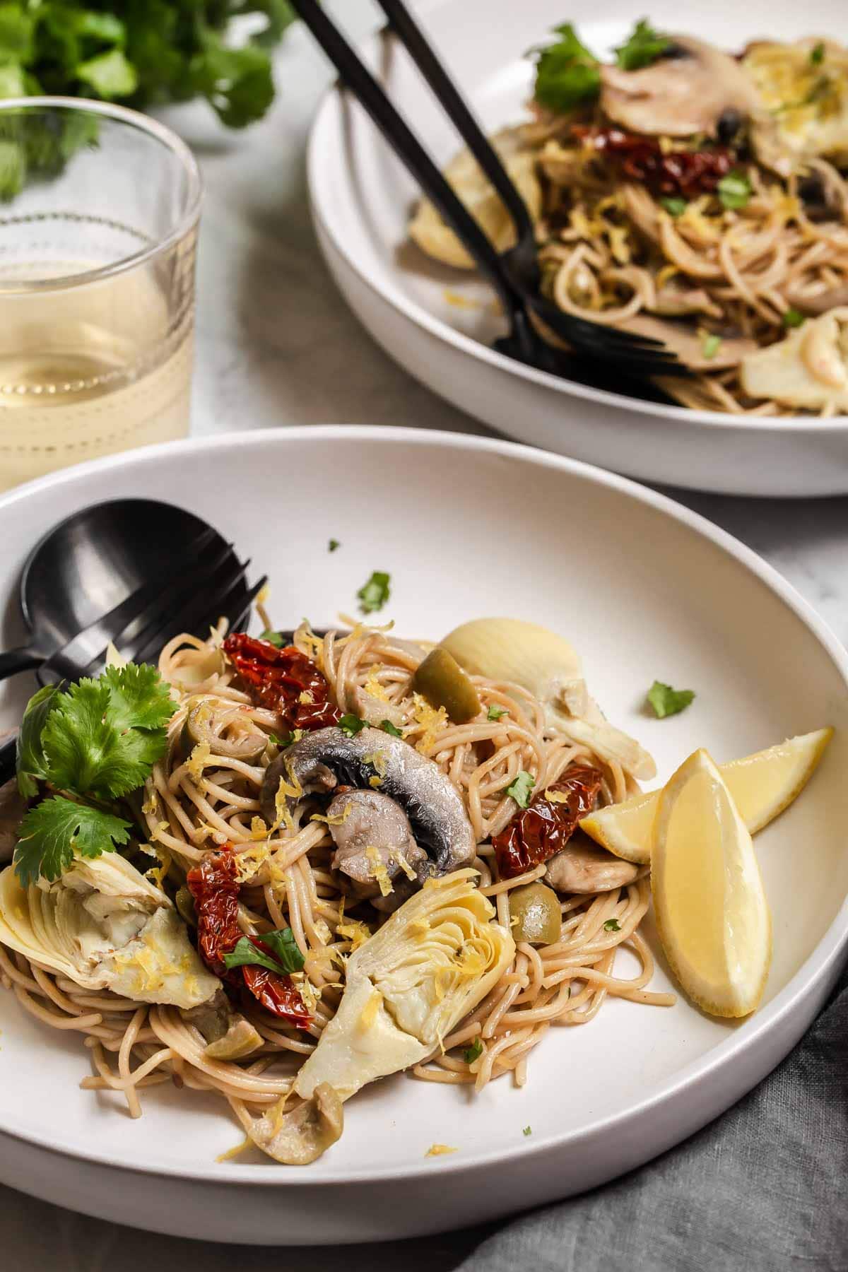 The entire sauce comes together in one pan while you cook the pasta. In just minutes, you can have noodles coated in a silky buttery wine sauce, studded with the best Mediterranean flavors: sun-dried tomatoes, artichoke hearts, olives, lemon zest, and mushrooms. Ok, mushrooms arenโt exactly Mediterranean, but when they turn golden brown and crisp around the edges in a dish, they serve as the meaty component to the dish, and we donโt complain one bit!