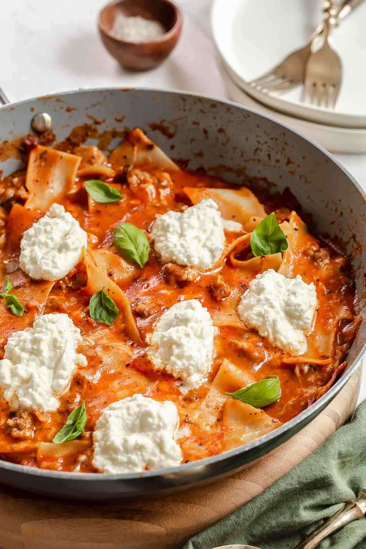 Easy skillet lasagna for two made with broken lasagna noodles!