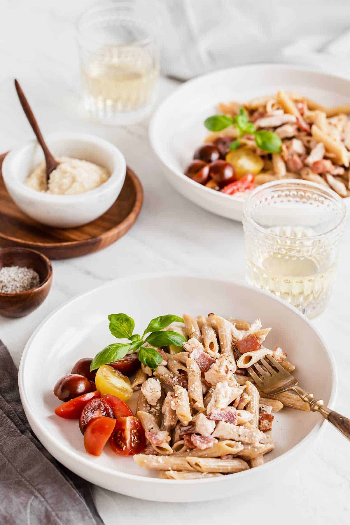 Chicken bacon pasta for two is light because itโs made without creamโit uses yogurt instead! This 5-ingredient pasta recipe comes together in less than 30 minutes, too!