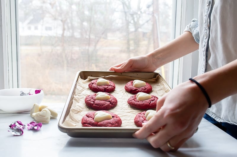 Made these cookies for Valentineโs day and they were a huge hit! Iโve never made red velvet anything before so I wasnโt sure how they would turn out but they were delicious. I used regular olโ liquid food coloring instead of gel, and just added a tiny bit extra to my dough, and they ended up being a super pretty dark red โ they looked great. I made 12 cookies out of the dough instead of 6 to get smaller cookies and still used the same temp and cook time with no issues. Will definitely be keeping this recipe for future use!