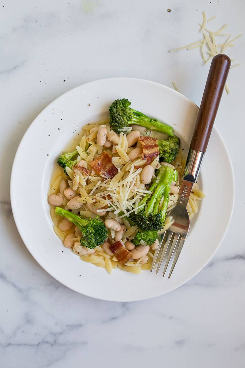 Orzo pasta with broccoli, white beans and bacon is an easy orzo recipe that the whole family will love. Crispy bacon mixed with broccoli and orzo with a chicken broth and a light Parmesan sauce.