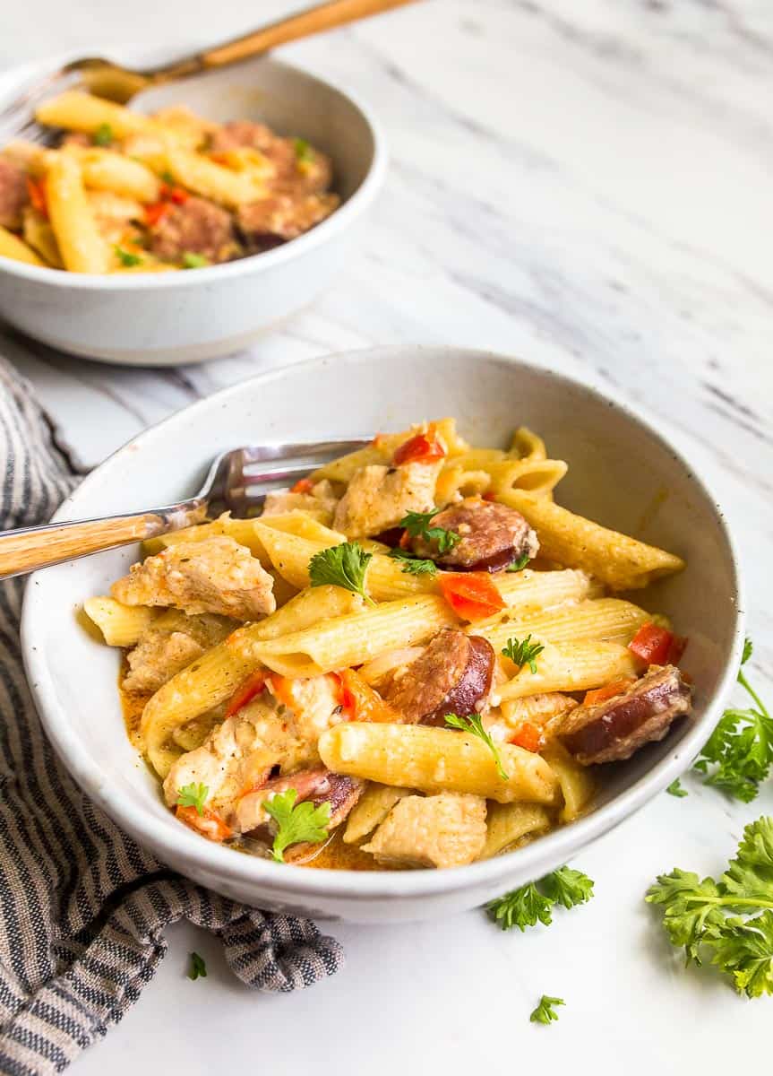 With my giant can of Tony Chachereโs Creole Seasoning (not sponsored, I just seriously love the stuff) leftover from making my Instant Pot Potato Salad, I got to work on a one pot meal that combined chicken, sausage, and pasta into a creamy crave-worthy meal.
