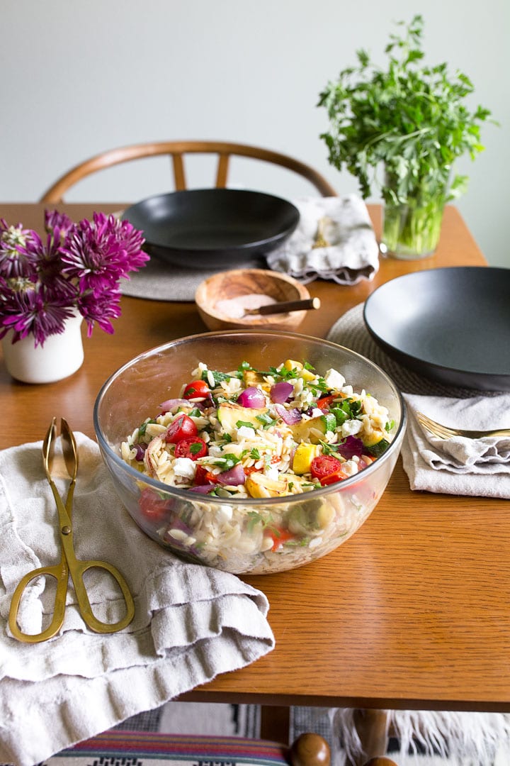This orzo pasta salad with feta and grilled vegetables comes together in about 20 minutes, provided you start everything around the same time. Plus, itโs delicious after it sits and cools, too. I serve it at room temperature frequently, and I also send my husband to grill chicken breasts to serve on top.