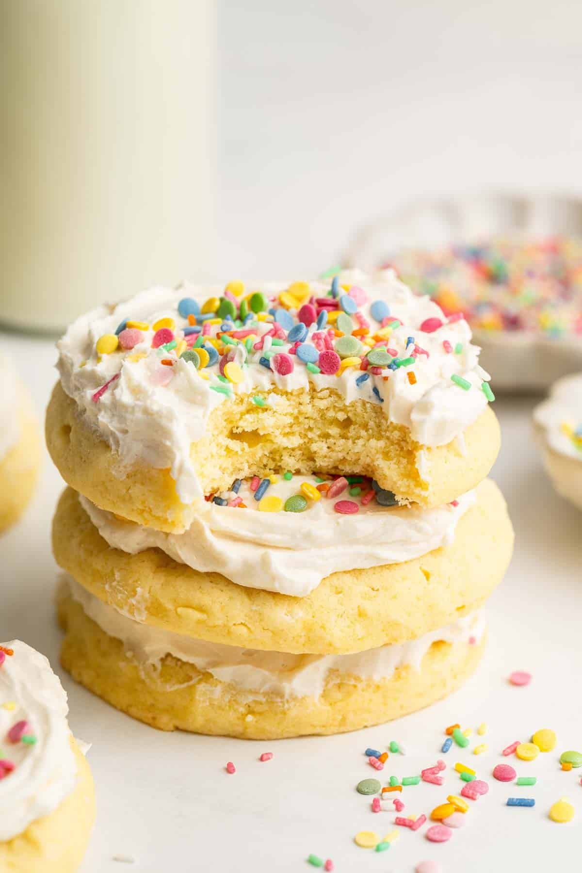 A homemade batch of the copycat grocery store sugar cookies with colorful frosting and sprinkles. These Lofthouse cookies are so fluffy, soft, and piled with frostingโeveryone loves them! Customize them with sprinkles that suit any season.