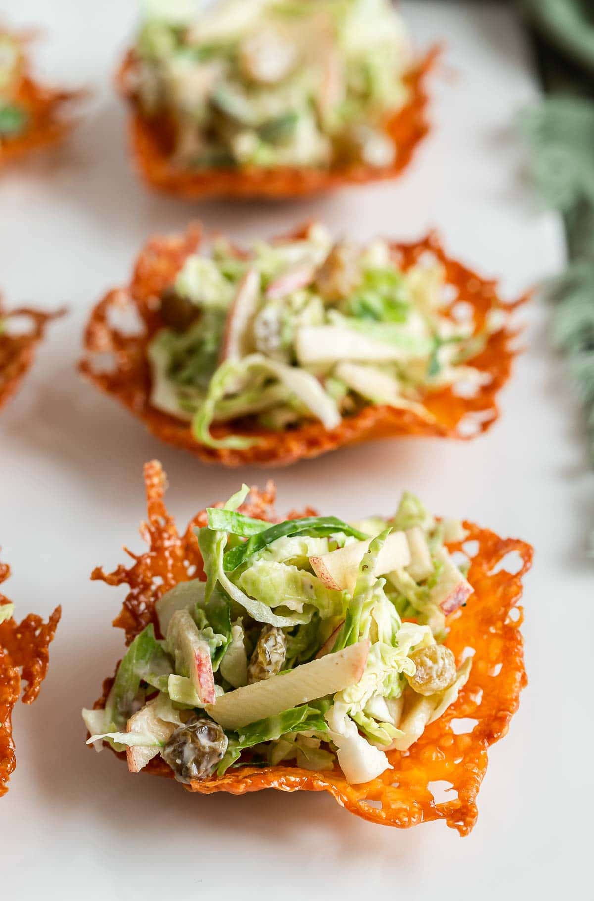 An amazing appetizer or side dish, this Brussels sprout slaw packed with apples, Greek yogurt, Dijon mustard, honey and golden raisins has it all! Serving it in mini cheddar cheese cups is totally optional, but very delicious. The slaw is great on a burger or alongside a plate of barbecue! Everything comes together in just minutes in one bowl! If youโre making the cheese cups for serving as a fancy appetizer, the slaw can be made ahead of time, too!
