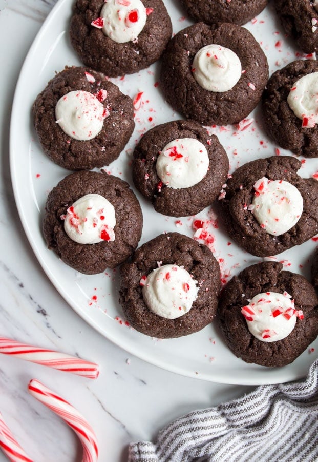 Chocolate thumbprints cookies filled with marshmallow cream and topped with crushed candy canes. The new Christmas cookie favorite for all of your holiday cookie exchange needs!