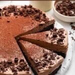 But, here’s the deal: this chocolate mousse cake is so delicious, that if you only have my regular cake pan, just use that! The cake might not come out perfectly and look like a perfect slice of cake from a Patisserie, but it will still taste just as delicious! In that case, try dipping your knife in hot water, running it around the edge to release the cake from the pan. From there, I suggest inserting a small spatula and lifting out the cake whole. Alternatively, you can cut a slice first and lift it out before attempting to lift the whole cake.