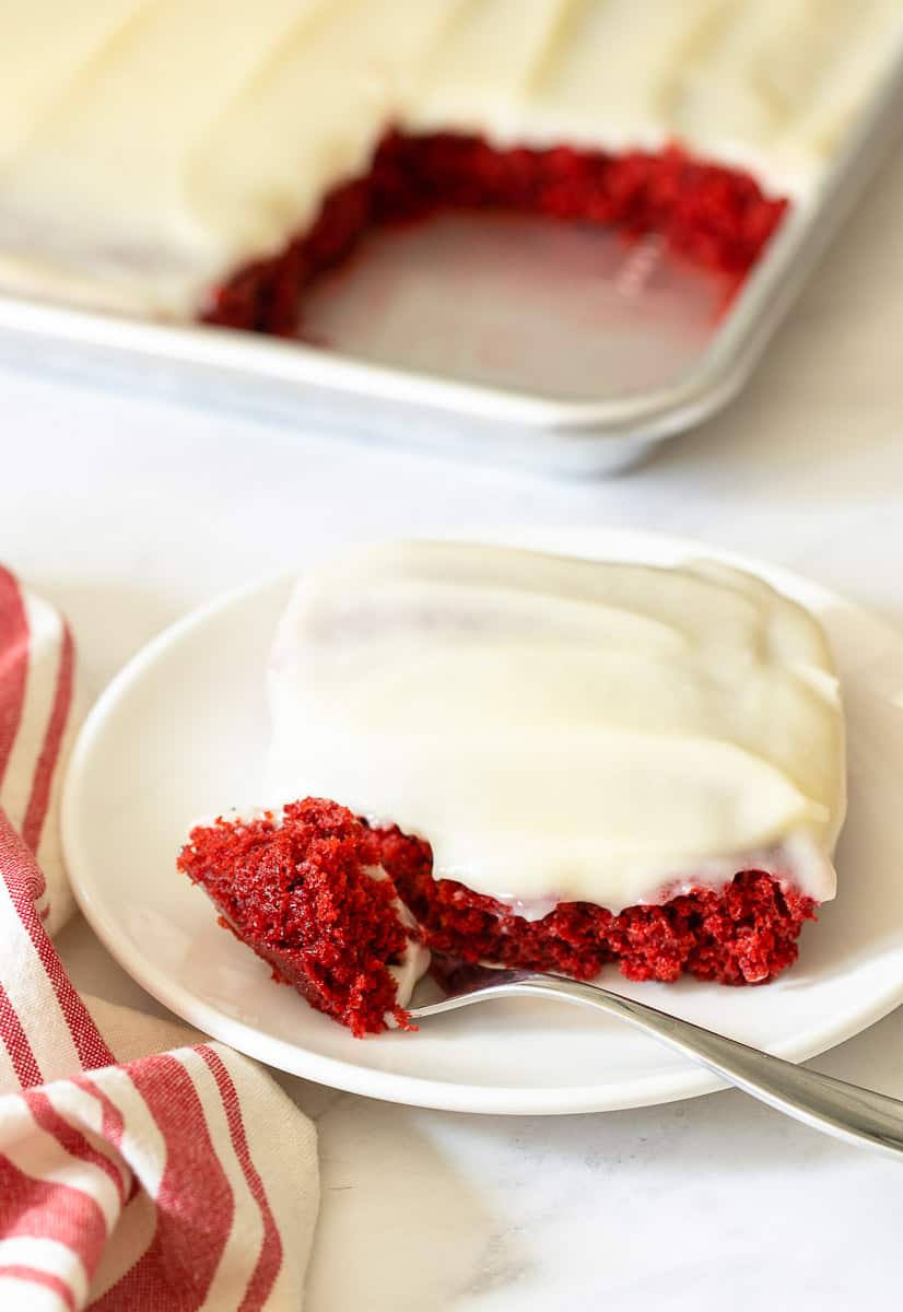 Sheet cakes are known for being super thin and unbelievably soft textured, and are most known for their warm frostings that are poured on top. The ratio of cake to frosting in a sheet cake is perfect, in my opinion. However, this red velvet sheet cake isnโt using a pourable frostingโjust a standard cream cheese frosting. I know you love my strawberry cream cheese frosting, and so youโll love this one, too!