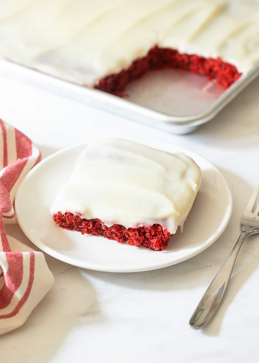 This red velvet sheet cake walked right into my life. Iโve been making smaller Texas Chocolate Sheet Cake for years, and even included a White Texas Sheet Cake recipe in my third cookbook, Sweet and Simple: Cooking for Two.